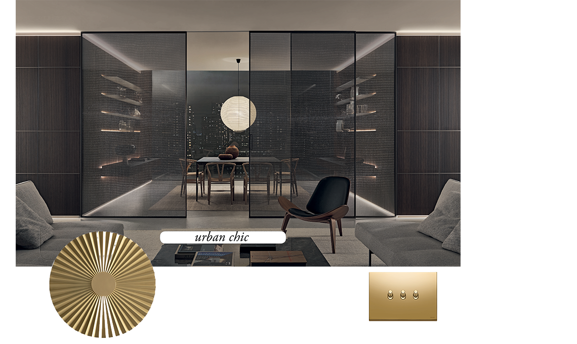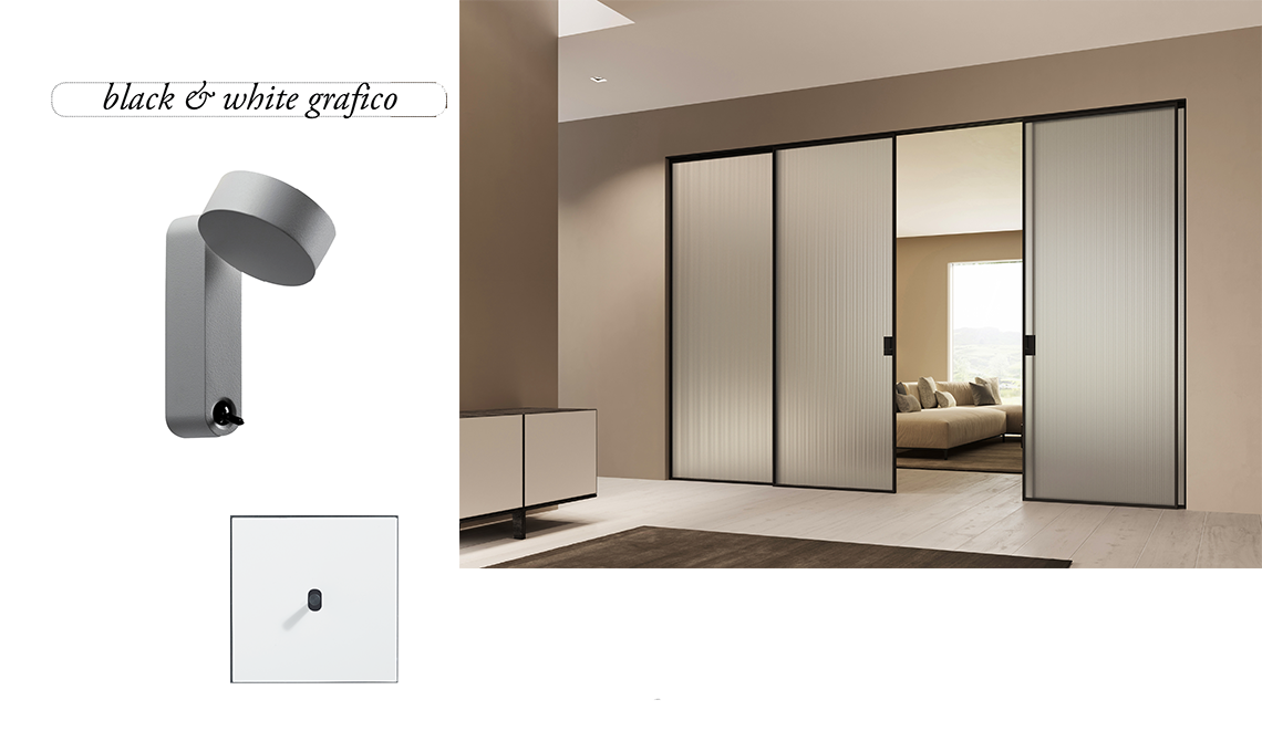 Black & white grafico Sistema scorrevole Delineo della collezione Scenario [FerreroLegno, 4 ante da cm 100x260h € 13.877], Toggle ha la testa orientabile [Martinelli Luce, cm 9,6x14,5x17h € 288], interruttore in alluminio della collezione Skin [PLH, cm 81x81 da € 154].