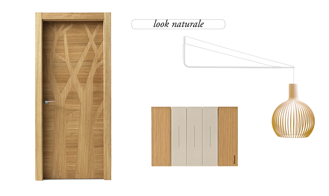 Porta Intalya Boulevard [Bertolotto, cm 80x210h prezzo da rivenditore], lampada con braccio Varsi 1000 e sfera in noce Octo Small [Secto Design, ø cm 45 prezzo a richiesta], interruttore Living Now, con placca Rovere in legno [BTicino, cm 12,5x8,6 € 50].