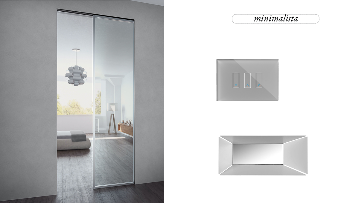Porta in vetro Acqua [Scrigno, cm 80x240h da € 860 più controtelaio], interruttore smart in vetro, gestibile anche da voce [iotty, cm 12,5x8,5 € 79], applique Narciso [Karman,