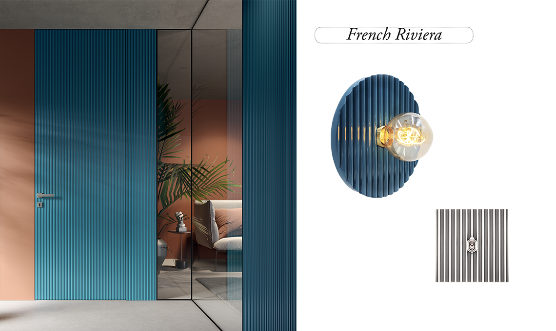 Laccate nel colore Blu azzurro (codice RAL 5009), la porta Filomuro e la boiserie sono entrambe della collezione Quadro, dalla superficie scanalata in legno che crea un suggestivo gioco di volumi in 3D [Garofoli].