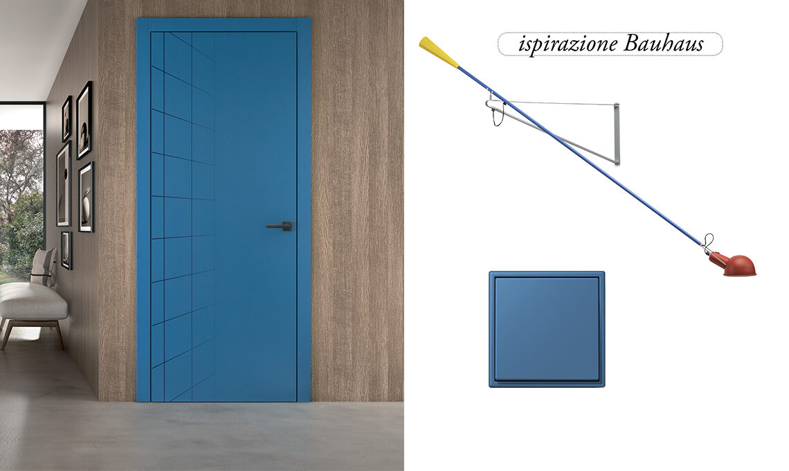 Collezione Accademia [GD Dorigo, cm 80x210h € 880 con decoro su un lato], lampada a Led regolabile 265 Chromatica [Flos, il braccio cm 205 € 990], interruttore LS 990 nella nuance Bleu Céruléen 31 [Jung, cm 8,1x8,1h € 38,18].
