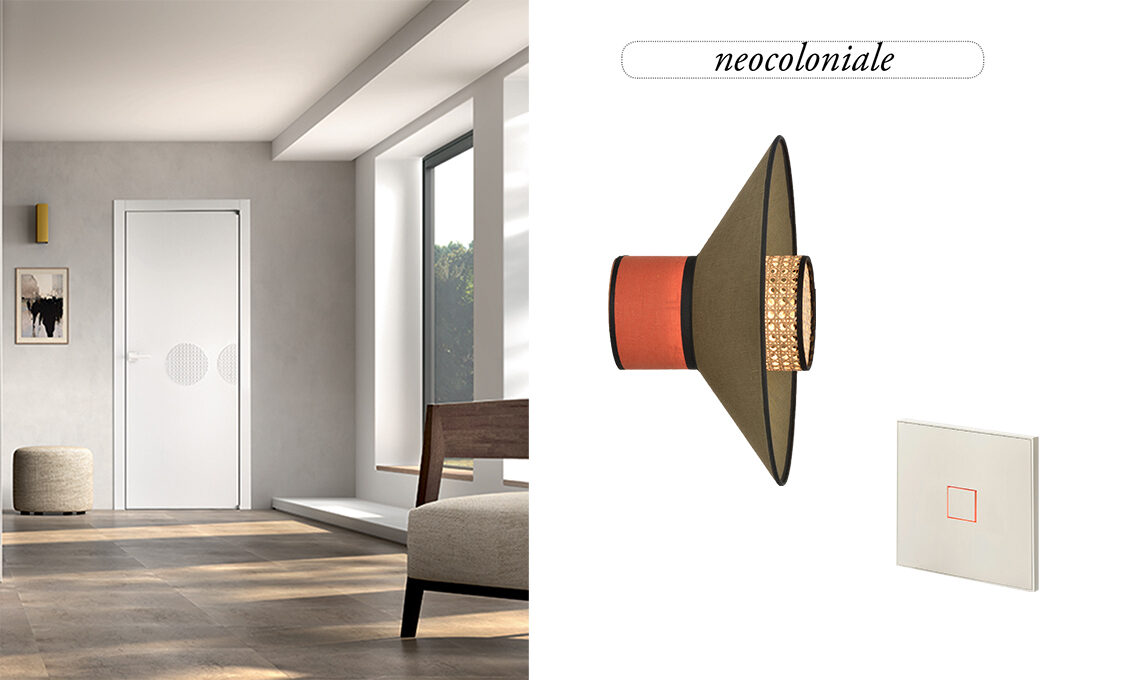 Porta a battente Flower [Leroy Merlin, cm 80x210h € 529,90], applique cromata Minimal [Ideal Lux, cm 12x21x23h € 94], interruttore rotativo vintage Roo Stigma Originale [Katy Paty,