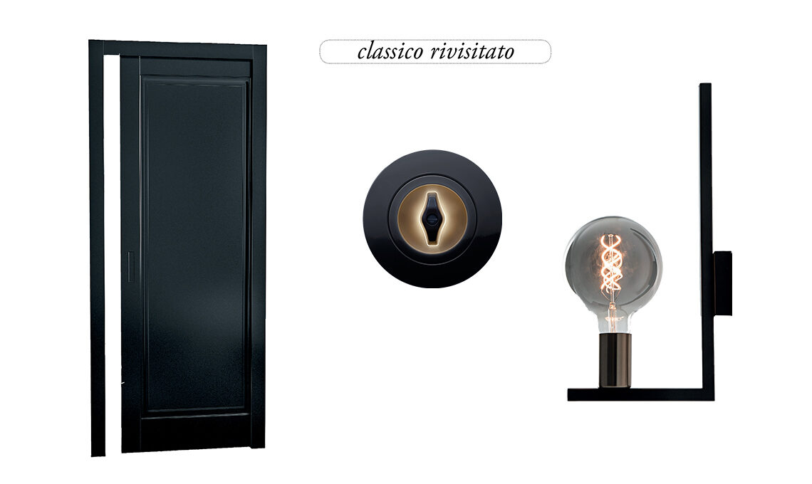 Scorrevole a scomparsa, Classika [Flessya, cm 80x210h € 1.593], portalampada in ottone, AppliqueTwin [Rossini Illuminazione, cm 19,5x39h da € 213,50], interruttore rotativo illuminato Serie 1930, finitura Nero lucido [Berker, cm ø 8,5 prezzo su richiesta].