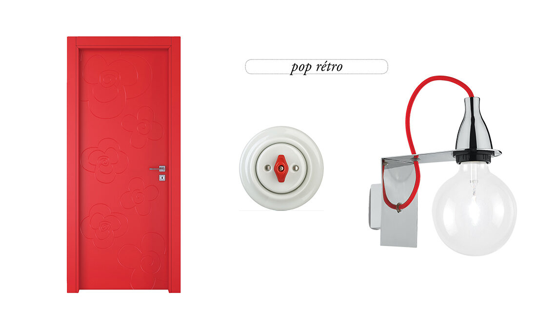 Le linee perfettamente squadrate della porta a battente Flower sono ingentilite dalla laccatura di un rosso intenso e vivace e dall’incisione sull’anta di tante maxi-corolle di fiori dal design stilizzato tipicamente vintage [Leroy Merlin].