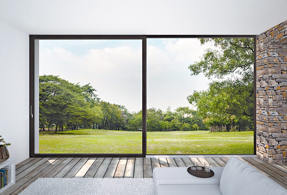 - 2 ante scorrevoli e 2 fisse per la porta G-Like Minia 1VT, composta da un vetro trasparente qui con eleganti profili nella finitura bronzo [Gidea].