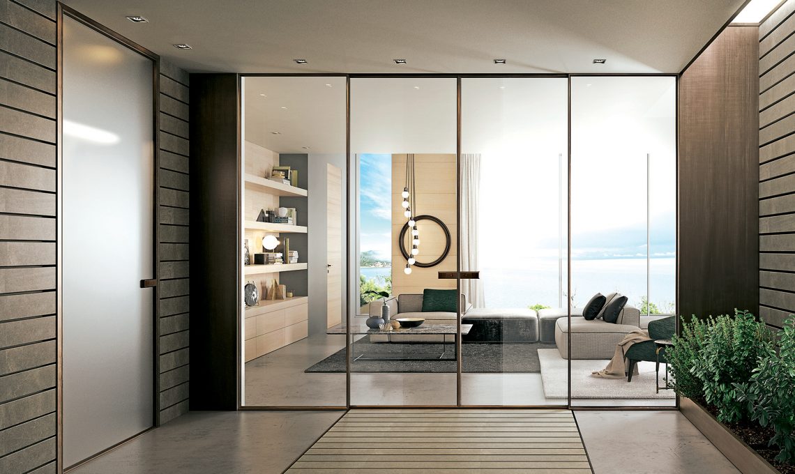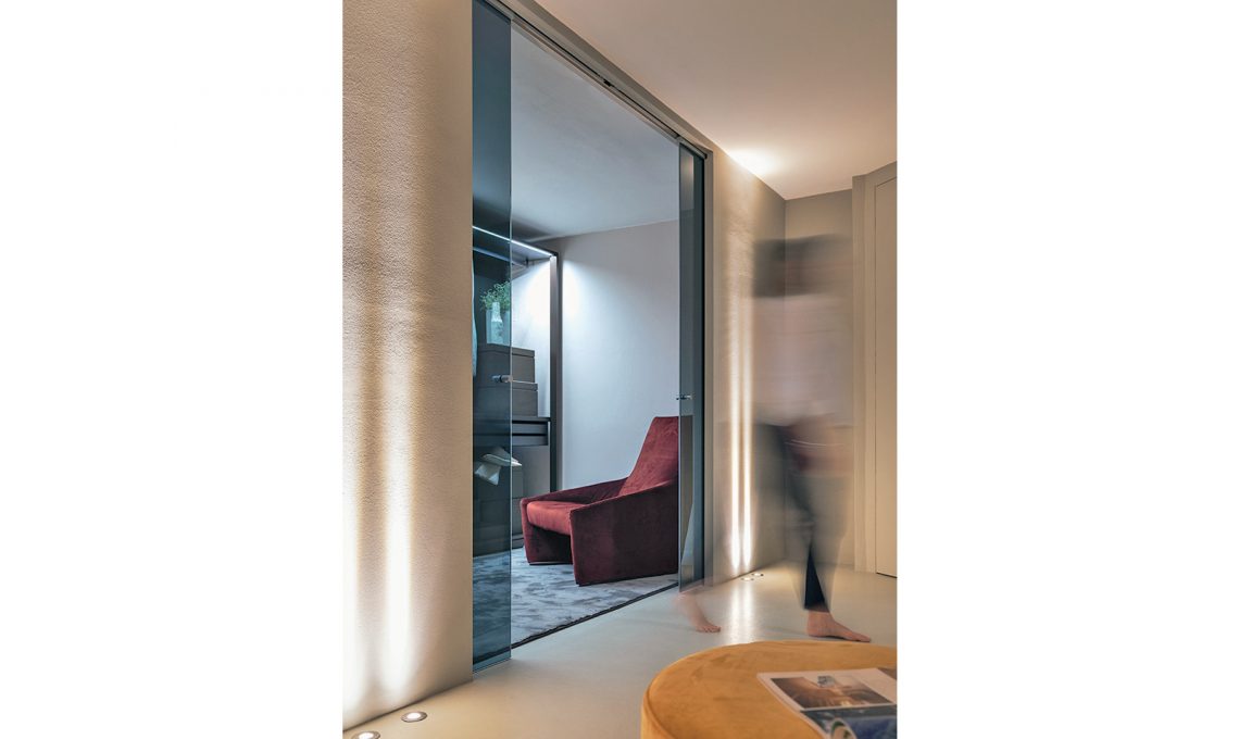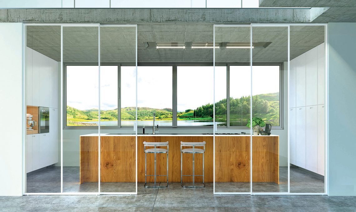 - Incasso a soffitto per l’eterea parete vetrata Scenario, qui nel modello Delineo, con grandi ante scorrevoli dalle ante con profilo laccato bianco e Cristallo extra chiaro [FerreroLegno].