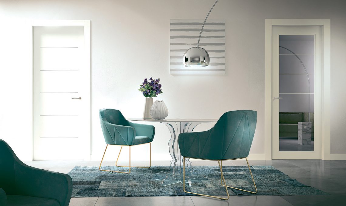 - filtra una luce calda e diffusa grazie agli inserti in vetro acidato con decoro sabbiato la porta in legno laccata bianca Venus [GD Dorigo].