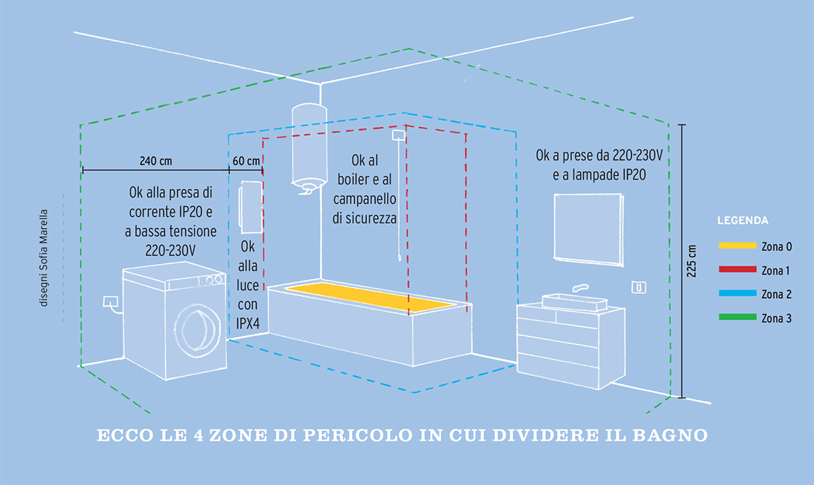 Volume sopra doccia o vasca fino a cm 225h da terra: sono vietati interruttori e prese. Ok allo scaldabagno e ai campanelli di sicurezza con cordino isolante, il più in alto possibile.