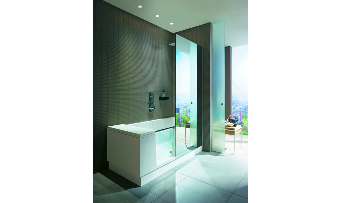 Vasca e doccia walk in Shower + Bath, angolare destra, in DuraSolid® A bianco satinato, con parete doccia in vetro trasparente o a specchio [Duravit, cm 170x75x210,5h prezzo dal rivenditore].
