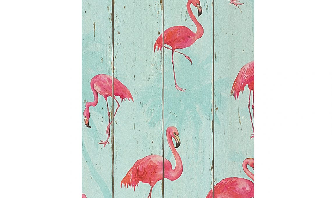 Flamingo sul verde acqua del trompe-l'oeil con assi vintage; décor Home PassionV di Barbara Becker, in Tessuto non Tessuto [da J&VStore rollo m 10,5x0,53h]