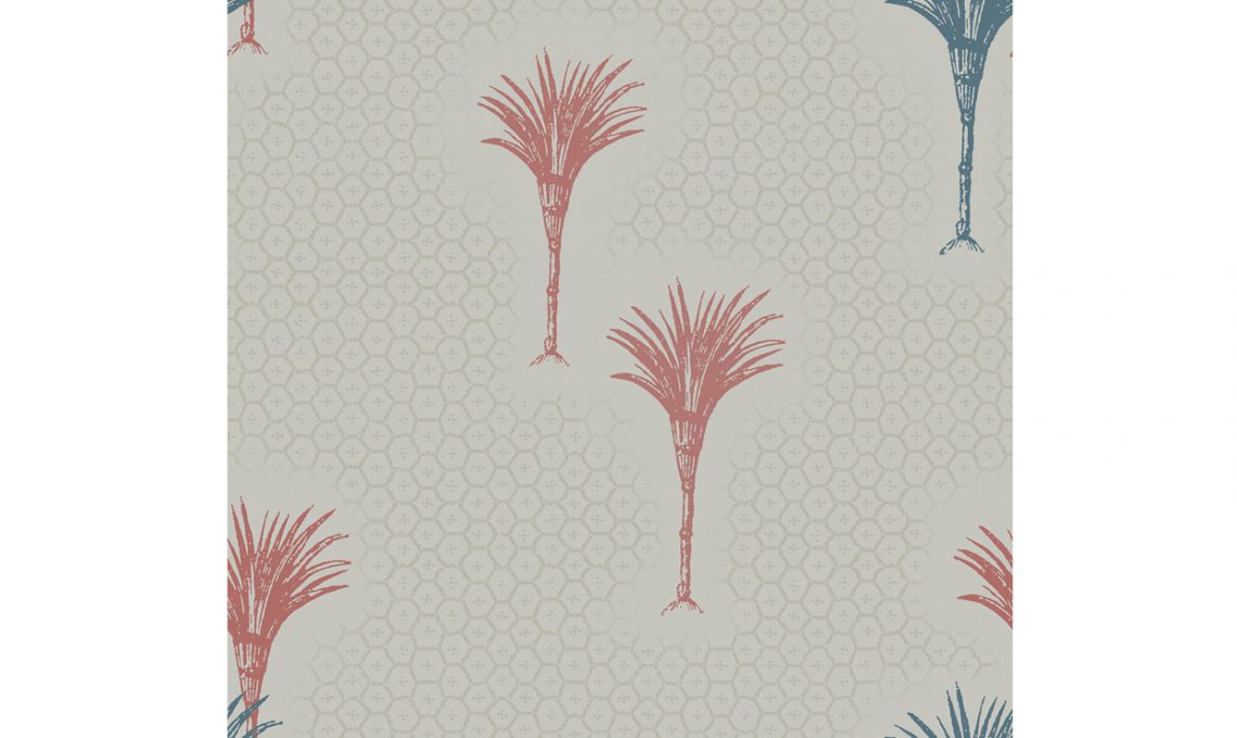 Le palmette in rosso&blu délave, creano un pattern botanico fuori dal tempo; linea City Garden, in Tessuto non Tessuto [da J&VStore rollo m 10,5x0,53h]