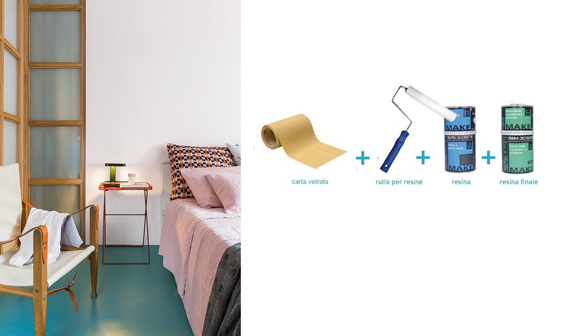 - Finisci stendendo una mano di resina finale protettiva opaca [MAKE da Leroy Merlin €49,90/lt, resa 10 mq].