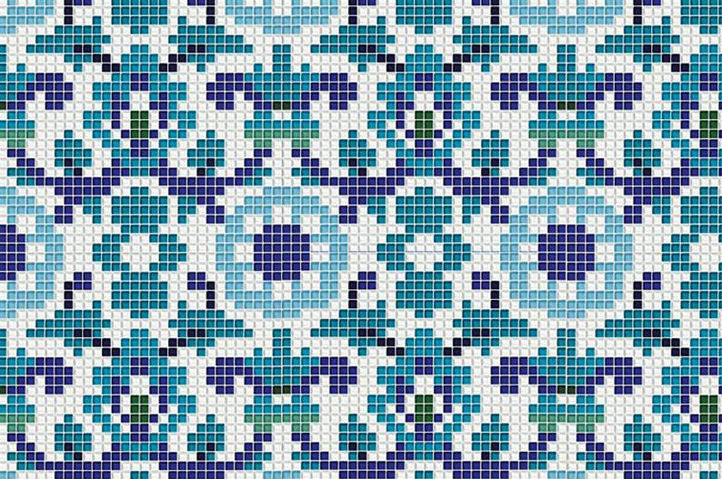 Vetrina, mosaico artistico in vetro con decoro computerizzato [Mosaico+, cm 1x1 la tessera, €700/mq].