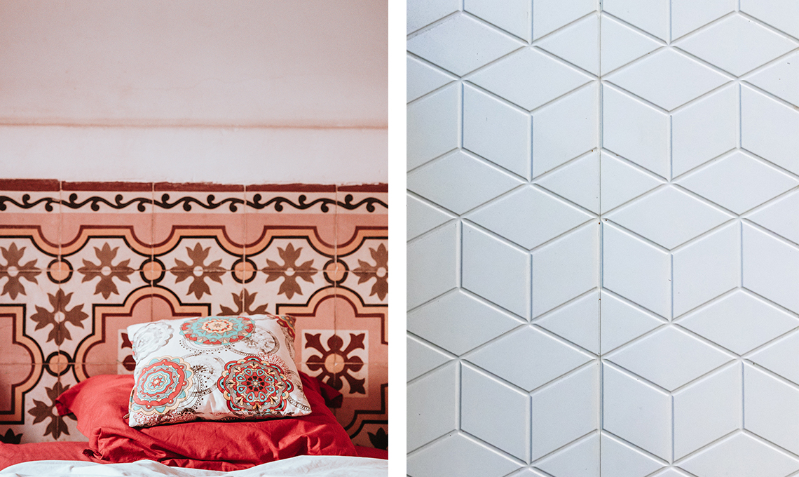 - Se non volete riempire tutta la parete, un’opzione ancora più interessante, è quella di posizionare le cementine come una boiserie per creare una vera e propria testiera del letto di grande personalità.