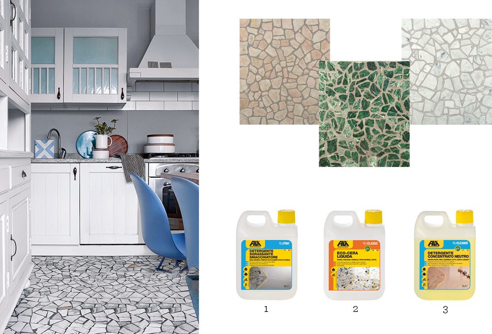 Piastrelle in pietra naturale, sono ideali in cucina perché resistono all’usura e isolano dalle onde elettromagnetiche generate dalla presenza dell’impianto elettrico e degli elettrodomestici.