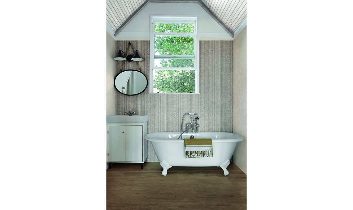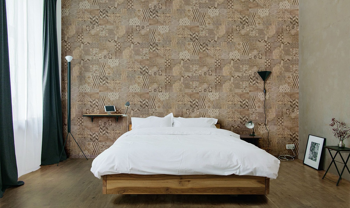 Della collezione Marazzi Fabric, un rivestimento adatto alla camera da letto: in monocottura, mescola diversi grafismi ispirati al tessile e ha un effetto "caldo" che si adatta anche alla camera da letto.