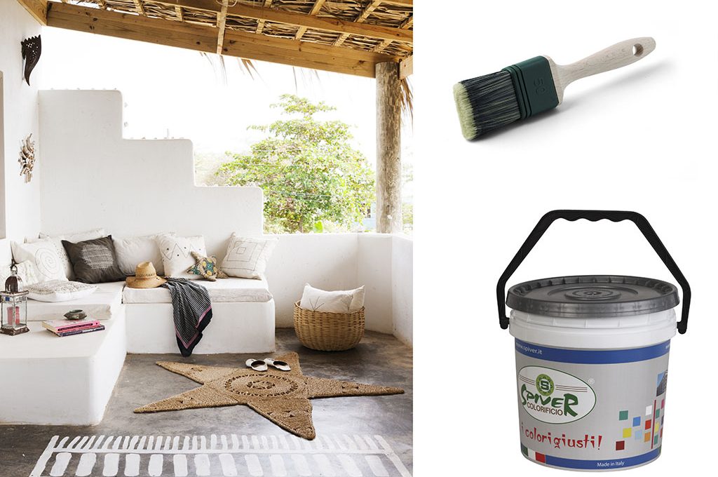 Per dipingere su base cementizia servono un pennello strong da 4 cm con fibre sintetiche e una 'corposa' pittura epossidica all'acqua, impermeabilizzante e smacchiabile.