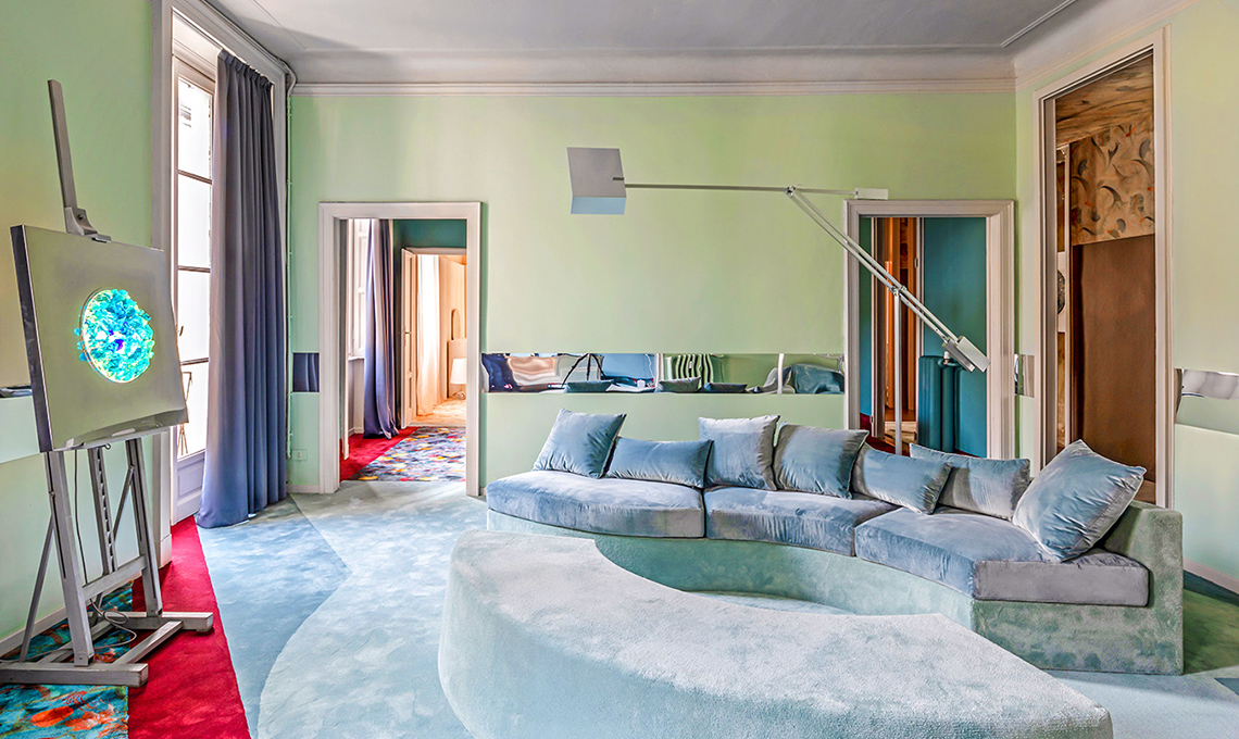 Super versatile: la moquette si può usare come boiserie o come rivestimento di panche, nicchie, tavoli o scale. E, tagliata su misura, diventa tappeto anche con grafiche a piacere.