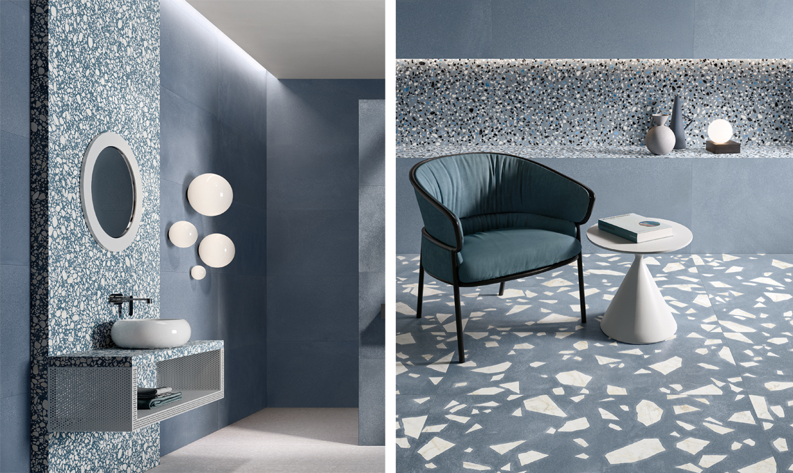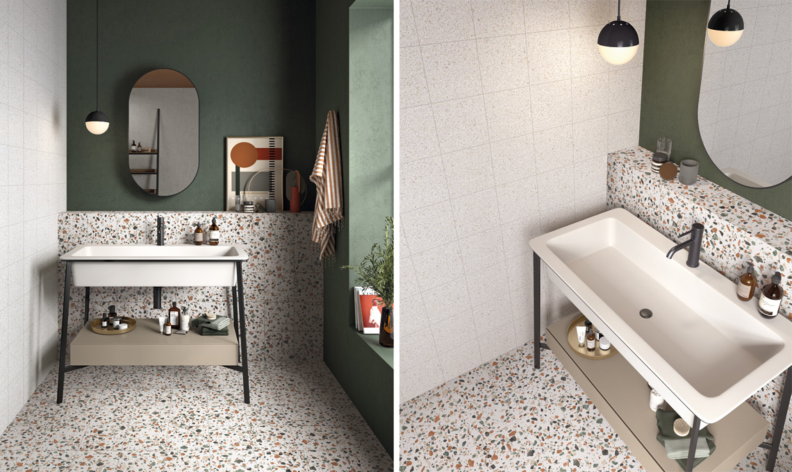 La collezione Medley interpreta in chiave contemporanea l'estetica del battuto di terrazzo alla veneziana in piastrelle in ceramica disponibili in diversi colori e dimensioni [Ergon, cm 60x120 €89,90/mq].