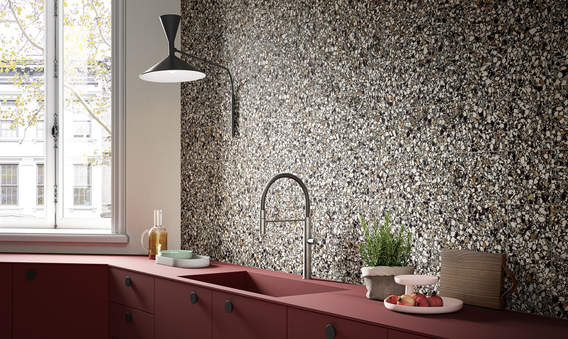 La collezione di rivestimenti Venice Villa rivisita il tradizionale terrazzo alla veneziana con la praticità del gres porcellanato. Disponibile in diversi formati, colori e finiture [FMG Fabbrica Marmi e Graniti, prezzo su progetto].