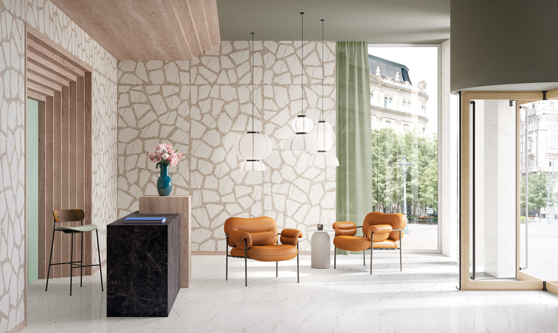 Foyer Inlay Clear con decoro palladiana disponibile in diversi formati e colori [Marca Corona, nuovo formato grande lastra ultrasottile cm 120x278, spessore mm 6, €129/mq].