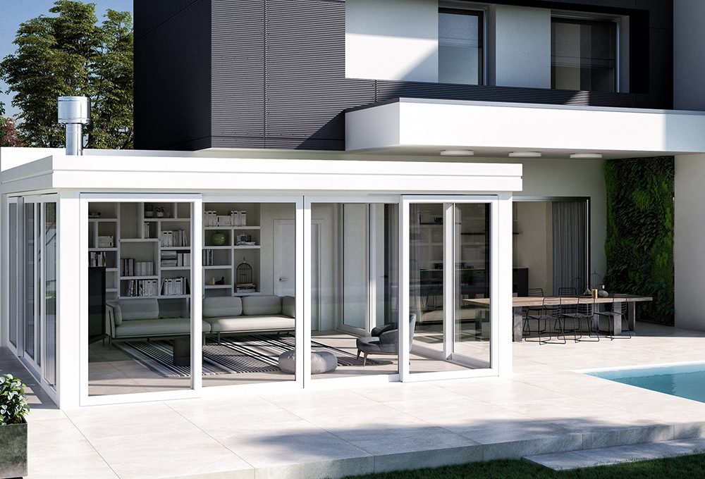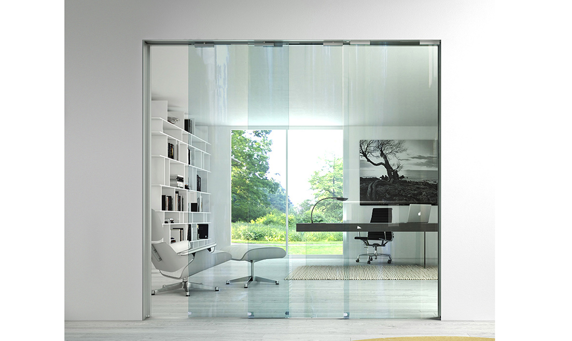 Il controtelaio a scomparsa Essential Trial contiene 3 ante scorrevoli in vetro, collegate tra loro da un sistema di trascinamento [Scrigno, misure e prezzo su progetto].