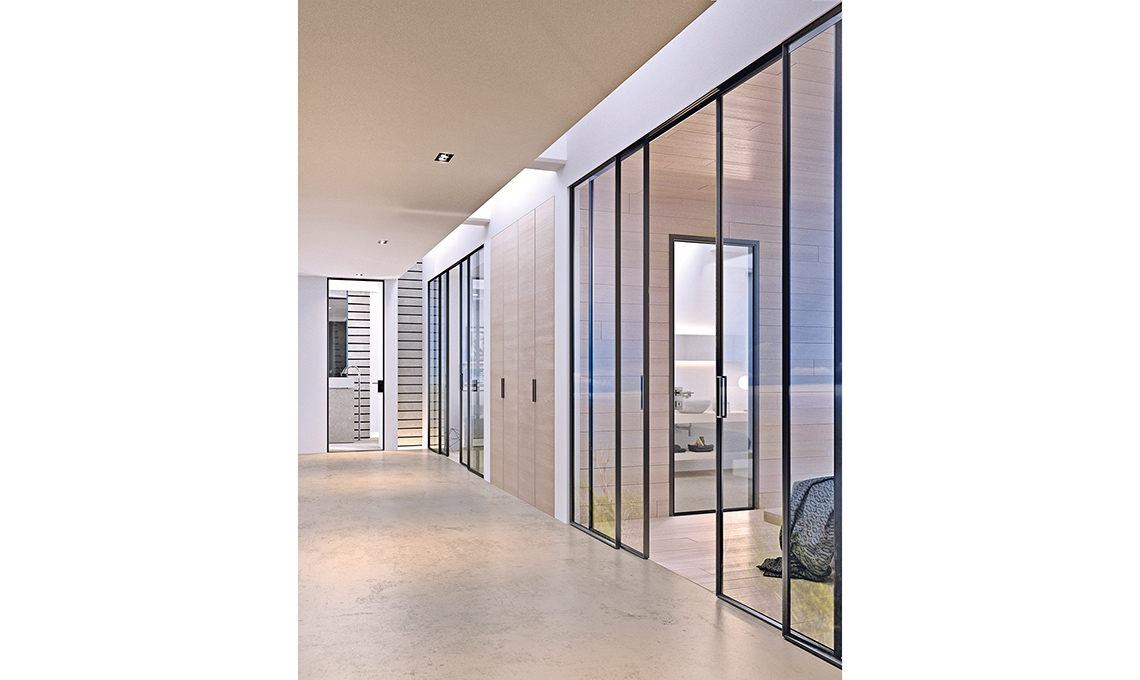 Montata su una guida a soffitto a scomparsa, la porta scorrevole Quasar è composta da 3 ante vetrate con telaio in alluminio laccato titanio [Cocif, cm 400x270h €1.890 + Iva].