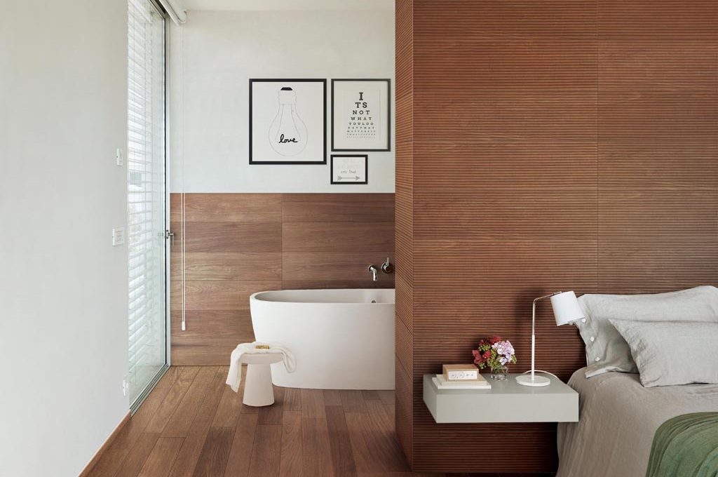 La camera trendy, aperta sul bagno, è scaldata da ceramica effetto legno, Wood Selection: dietro al letto, Origami Iroko, cm 22,5x90; dietro la vasca, Iroko cm 11,2x90; a terra, Iroko nei 2 formati cm 11,2x90 e cm 15x90 [Ceramiche Piemme]