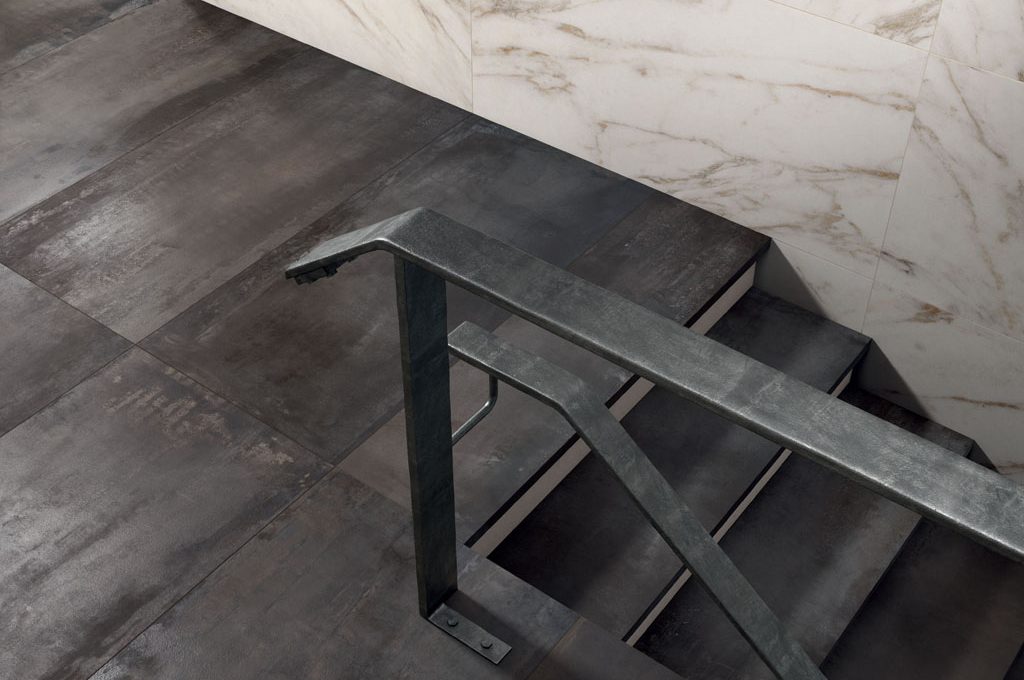 Industrial-style con i maxi formati della coll. Interno 9: per la scala gradone Top Dark, cm 32x120; per il pavimento Dark, cm 60x120. A parete, serie Sensi, colore Calacatta Select Sablè, cm 60x120 [ABK]