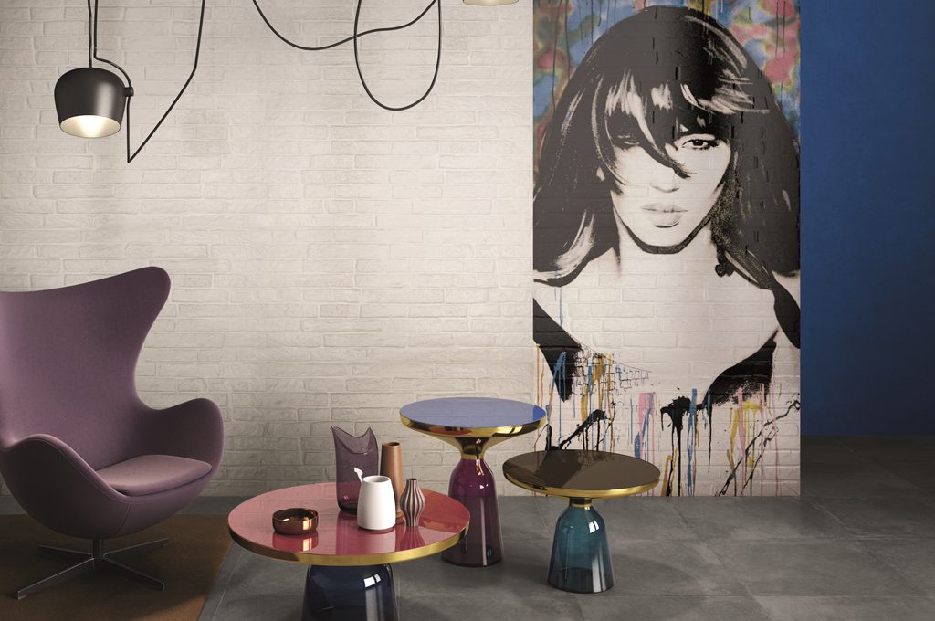 Basta pareti vuote e impersonali! Una scelta decisa è il pannello ceramico, stile graffiti, Street Miss You glossy, cm 120x240, con il formato chiaro cm 60x120, tutto coll. Do Up effetto mattone. A terra, coll. Docks Black patinato, cm 60x60 [ABK]