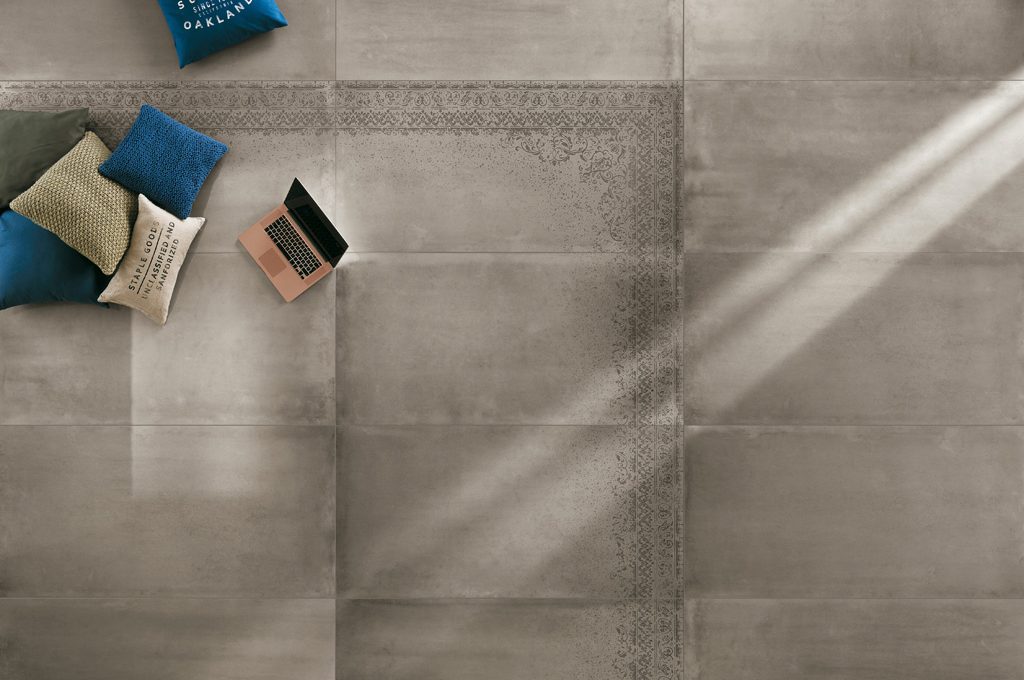 Per chi ama i contrasti: Frame Grey Brillante, cm 75x150, grès porcellanato che imita la resina, con il decoro Frame Carpet Grey, cm 75x150 che crea il trompe-l'oeil di un tappeto evanescente e senza tempo [Fap]