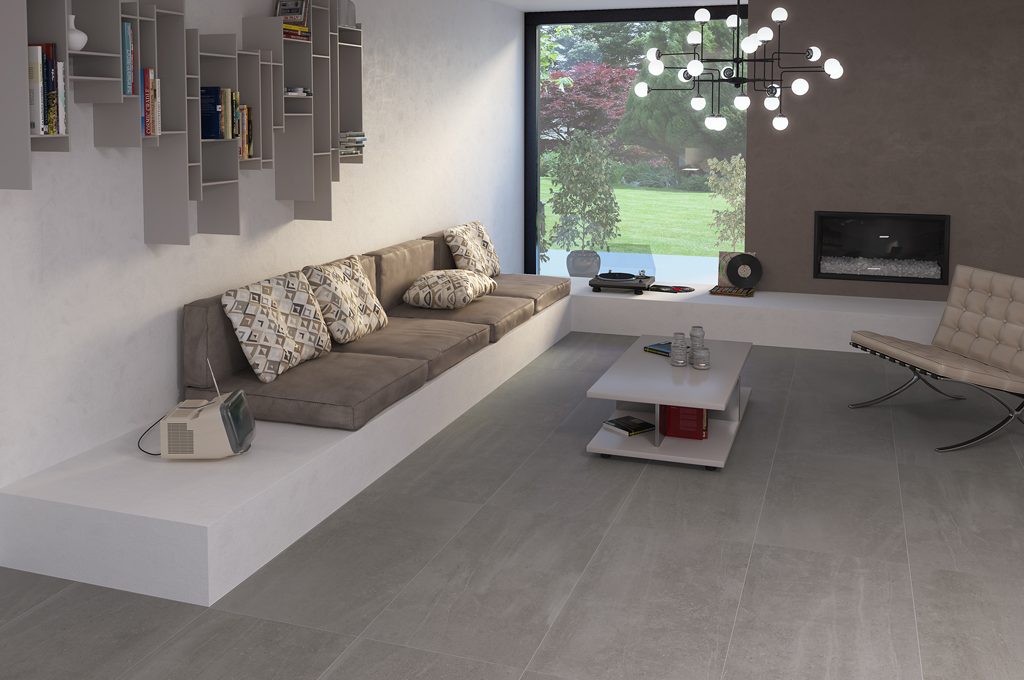 Nel living, con la base del sofà in muratura, il pavimento è realizzato con la collezione Uptown di Century, colore Hamilton, nel maxi formato cm 60x120 a finitura naturale [Fincibec Group]