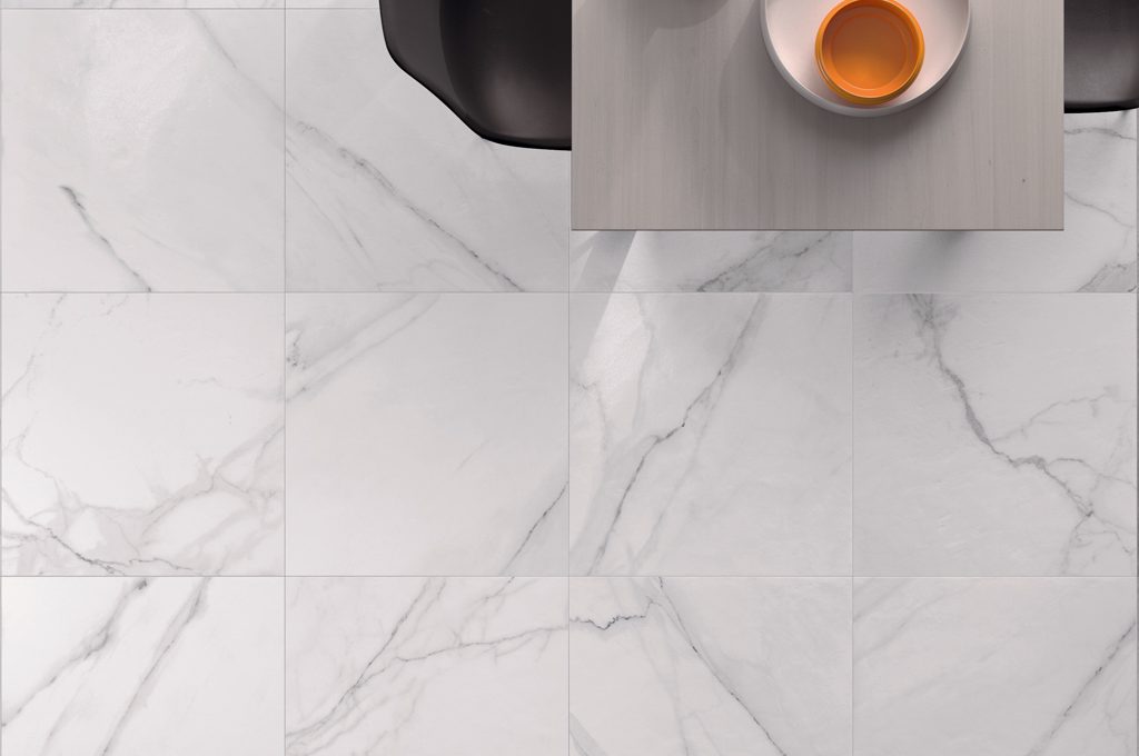 Nell'elegantissima zona pranzo, vista dall'alto, invece del marmo, c'è Royal Statuario in grès fine porcellanato, con bellissime venature, cm 60x60, collezione Supreme [Flaviker]