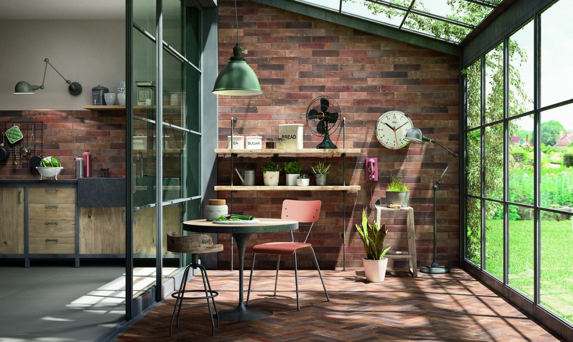 Nella veranda urban-country, perfetta combinazione della pareteTerramix marrone, cm 28x7, a effetto vecchi mattoni, con il pavimento della cucina, nel maxi formato Block silver, cm 90x90 [Marazzi]