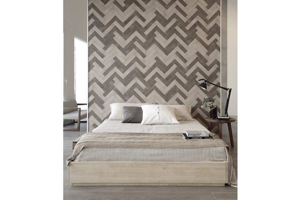 Super chic la ceramica anche in camera! La quinta dietro al letto è rivestita a effetto parquet sfalsato con piastrelle Rewind, nei colori Argilla e Corda+Vanilla, cm 28x7; a terra, mix di formati Woodtale effetto quercia [Ragno]