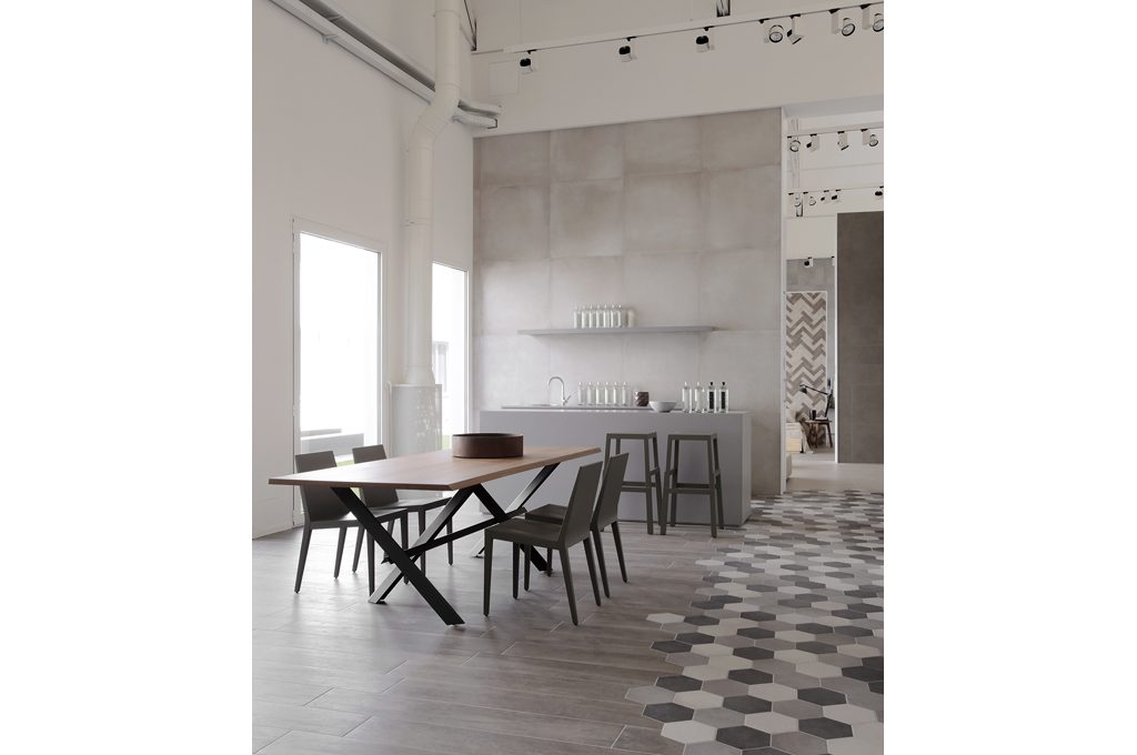 Sembrano cementine combinate con il parquet? Invece è tutto in ceramica: Esagone Rewind, nei toni Peltro, Polvere e Vanilla, confina con Woodtale quercia, cm 120x20. A parete, Rewind, nei toni Polvere e Vanilla cm 90x90 [Ragno]
