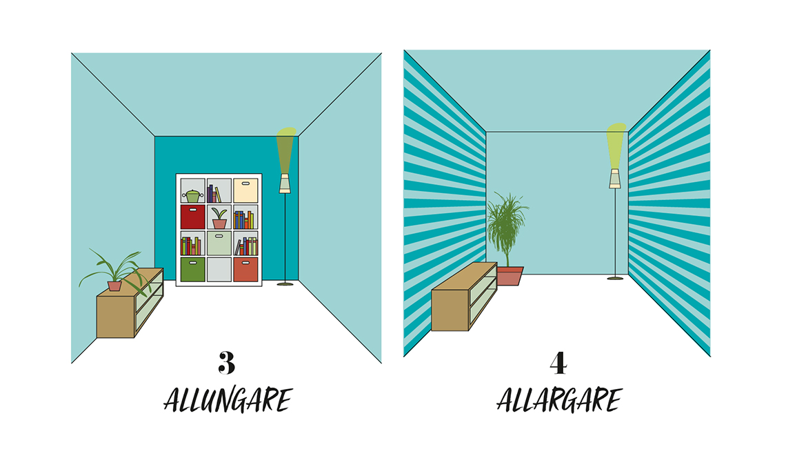 Stanza corta? Dipingi la parete di fondo di un colore scuro e la vedrai più proporzionata. Stanza lunga e stretta? Con delle righe colorate sui lati corti la allargherai.