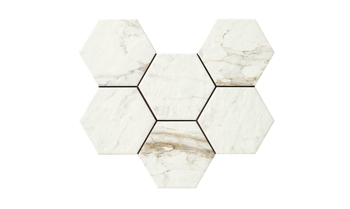 Decori da abbinare per il grès esagonale Oltremare Deco Oceano [Iperceramica, cm 40x35 €28,99/mq].
