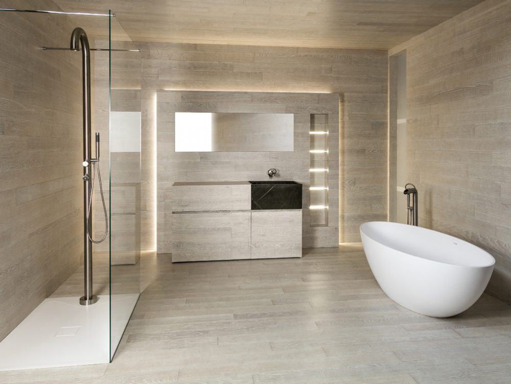 Rivestimento in monocottura ‘finitura’ tela Fabric Struttura 3D Basket Cotton (cm 40x120) e pavimento in grès che riproduce il legno Treverkview Miele (cm 20x120). [Marazzi].