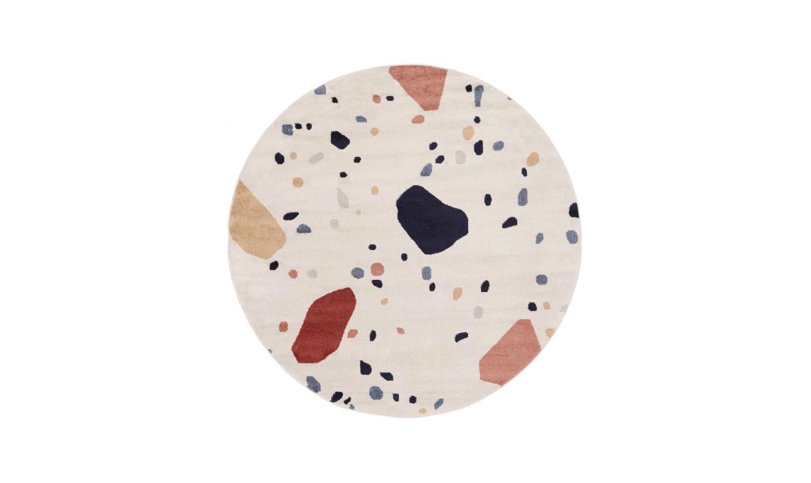 È possibile inoltre giocare con la texture effetto terrazzo adoperandola in chiave decorativa, sia per divertenti carte da parati da alternare a color block decisi, sia per accattivanti tappeti capaci di scaldare l’atmosfera. Come in questa proposta pensata per un angolo dedicato all’home office.