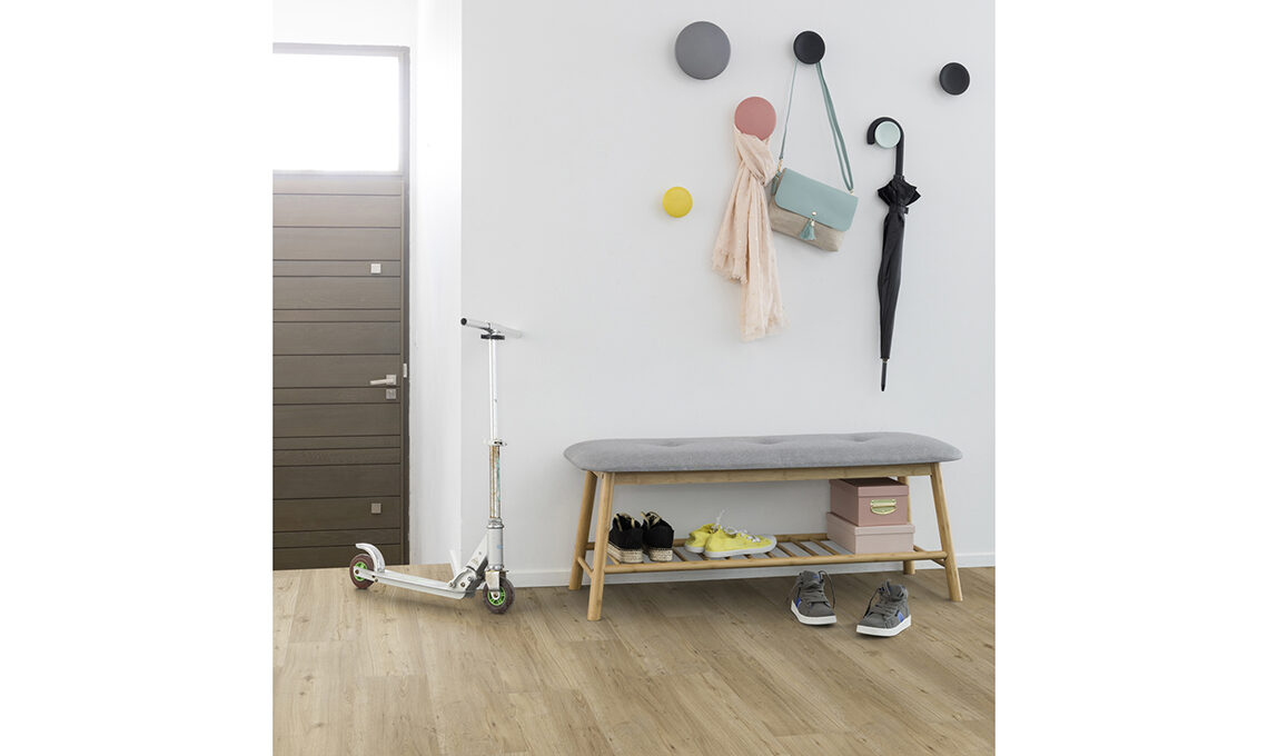 Grazie alla tecnologia Hydro+, ogni doga del laminato Ocean+, qui con decoro Retro Chic Blue Gray,