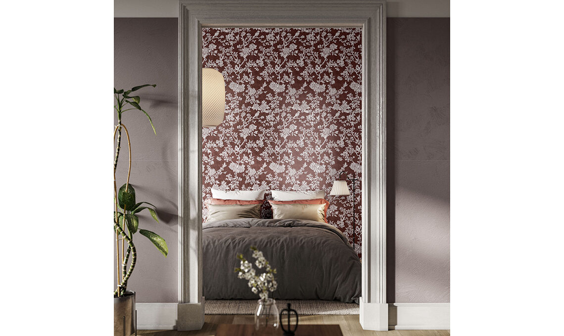 nel decoro Floral Bordeaux, capace di ricreare la matericità delle superfici in microcemento spatolato a mano [Gruppo Romani,