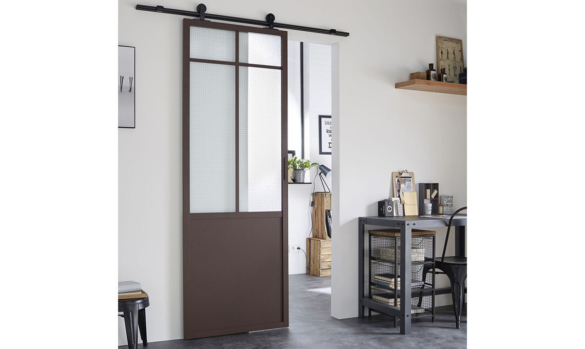 La porta composta dal pannello Work Artens in vetro temperato e alluminio [cm 86x215h € 230] scorre sul binario esterno Loft Nero [cm 186 € 89,90]. Di [Leroy Merlin].