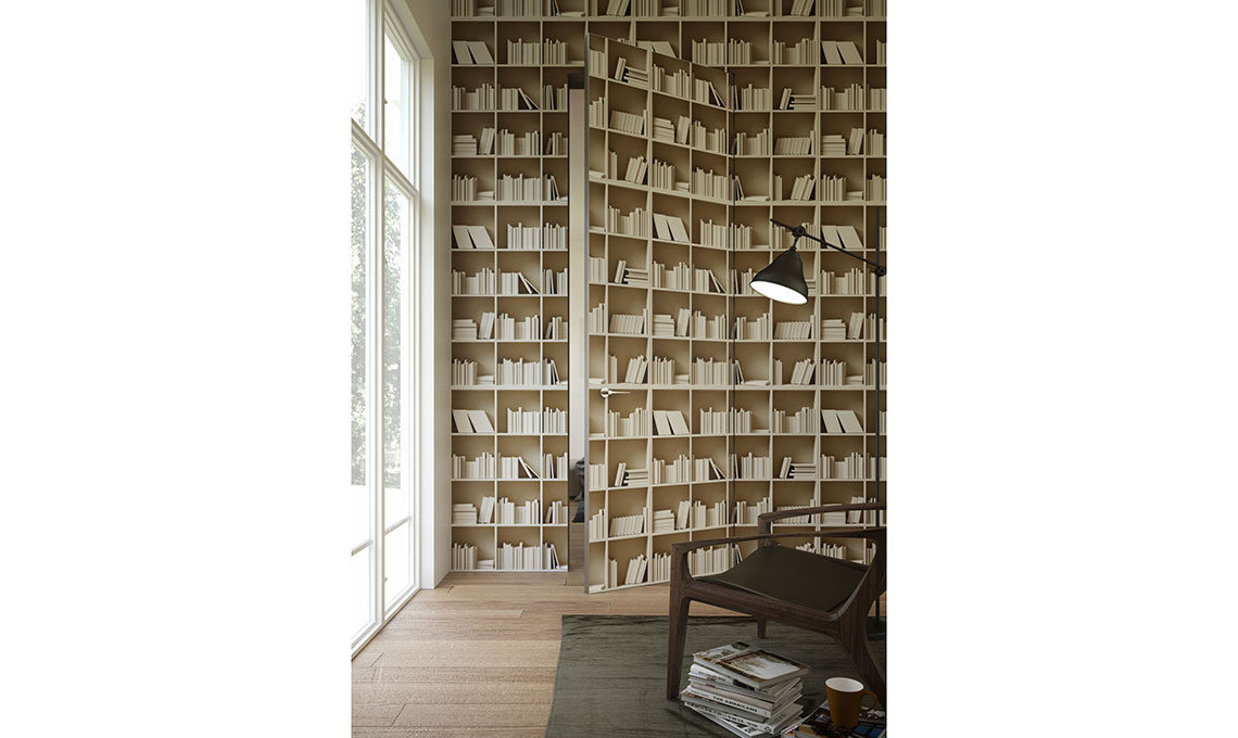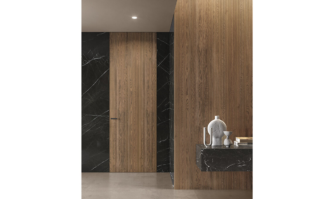In legno inciso, la filomuro a tutta altezza Onda in finitura rovere simula un rivestimento murale e può integrarsi con la boiserie della stessa serie [Garofoli, cm 90x270h € 3.539].