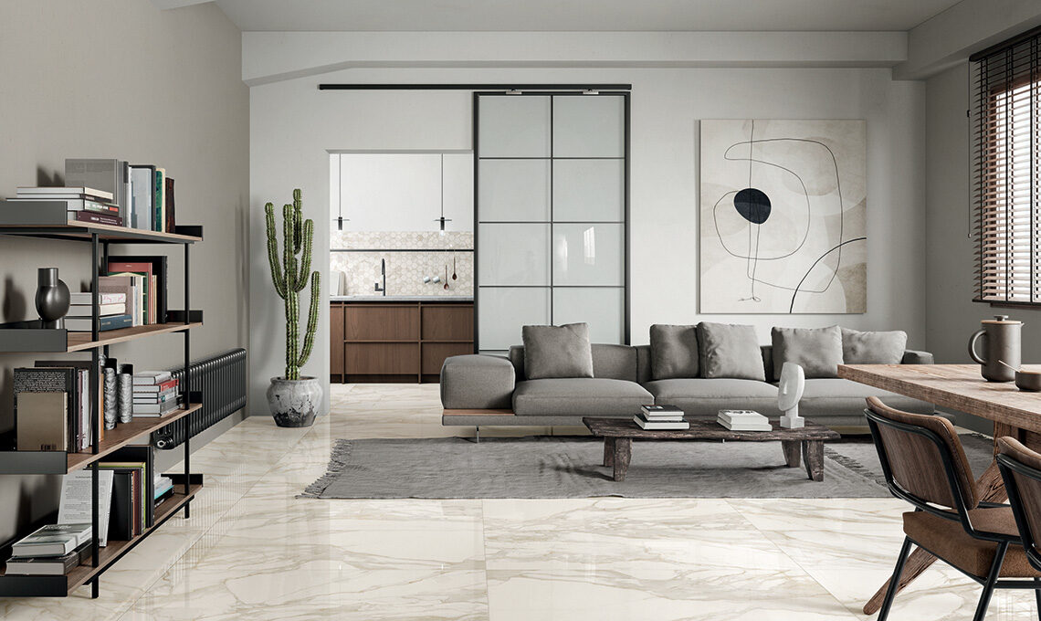 Elegante, lucidissimo e posato senza fughe, il grès rettificato e lappato Calacatta Gold riproduce la bellezza
