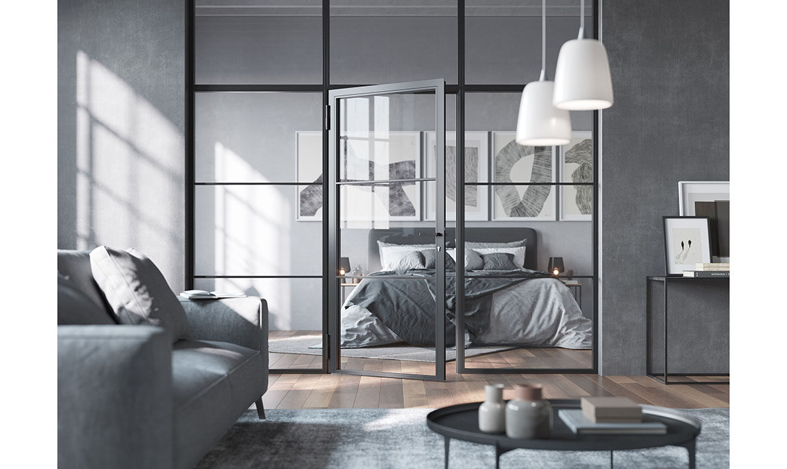Industrial style per il modello in vetro a battente LFT, qui da cm 100x210h. Può essere integrata a una parete vetrata con finestrature fisse dotate di vetri di sicurezza stratificati e di profili minimali in metallo laccato nero [Hörmann, misure e prezzo su progetto].