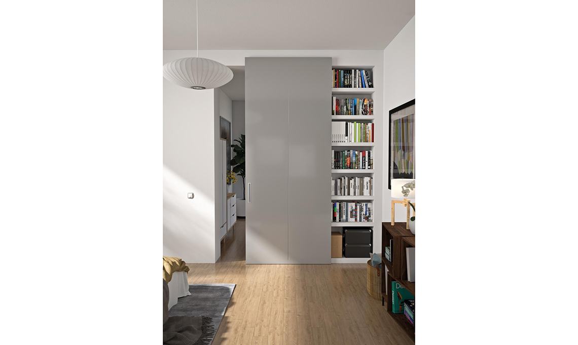 Ho un passaggio che dal soggiorno conduce a un corridoio che vorrei chiudere con una porta scorrevole che non mi rubi spazio. Non amo i binari a vista e non ho muri liberi dove incassare il cassonetto: sulla parete a sinistra del passaggio ho un mobile e sulla destra una nicchia adibita a libreria. Giulio B.