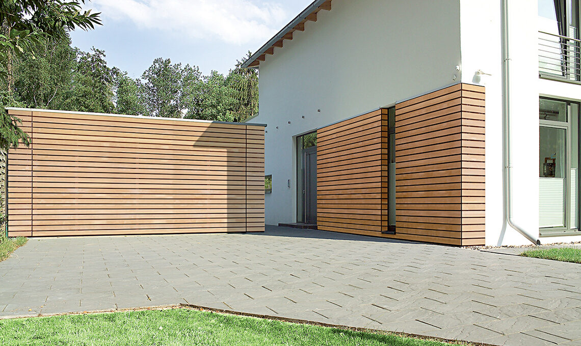 Portone sezionale in alluminio ALR F42, qui installato a filomuro e dotato di manto su cui è stato applicato lo stesso rivestimento in doghe di legno della facciata, per mimetizzarne la presenza. Altamente isolante, può essere rivestito con altri materiali e realizzato fino a 7 metri di larghezza