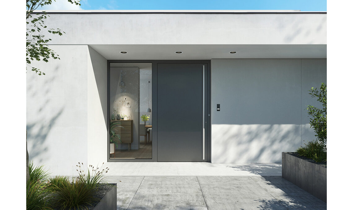 In classe antintrusione RC3, Schüco AD UP 75 è realizzabile a 1 o 2 ante con pannelli in ogni colore RAL e nei colori e finiture effetto legno o metallo. Qui è nella versione a un’anta con pannello grigio micaceo complanare al telaio e al vetro laterale fisso (progettabile anche apribile) più maniglia retroilluminata a tutta altezza [Schüco Italia].