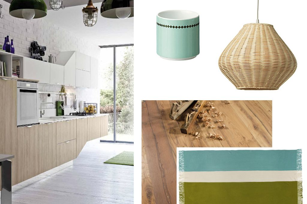 3 colori al massimo, ben coordinati tra loro. Noi abbiamo scelto azzurro verde e blu da riportare su tessili e stoviglie, più un tocco green con la lampada in rattan.